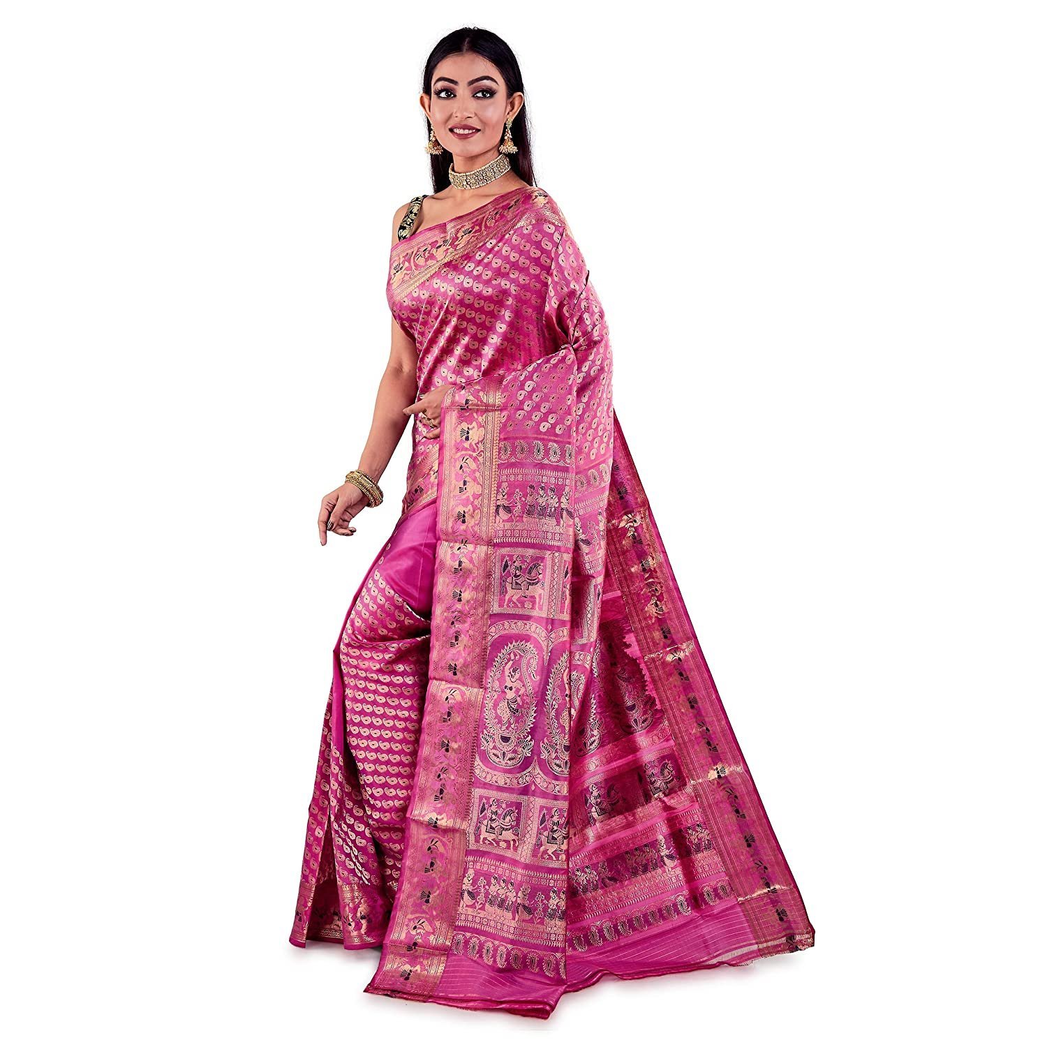 Sareesofbengal Women’s Allover Meenakari Baluchari Swarnachari Silk Katan Silk Saree Pink