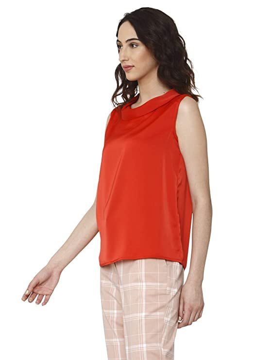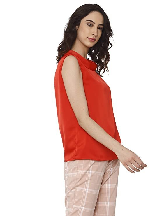 Vero Moda Women Red Solid Cowl Neck Sleeveless Slim Fit Cropped / Short Casual Wear Top